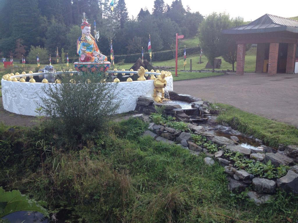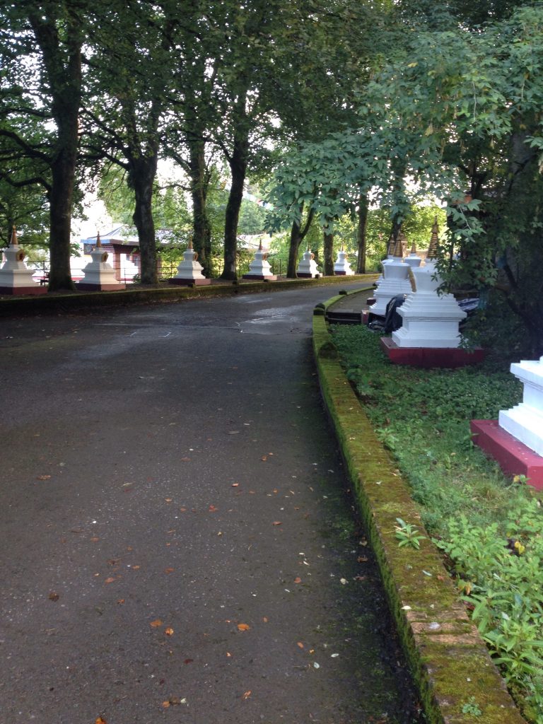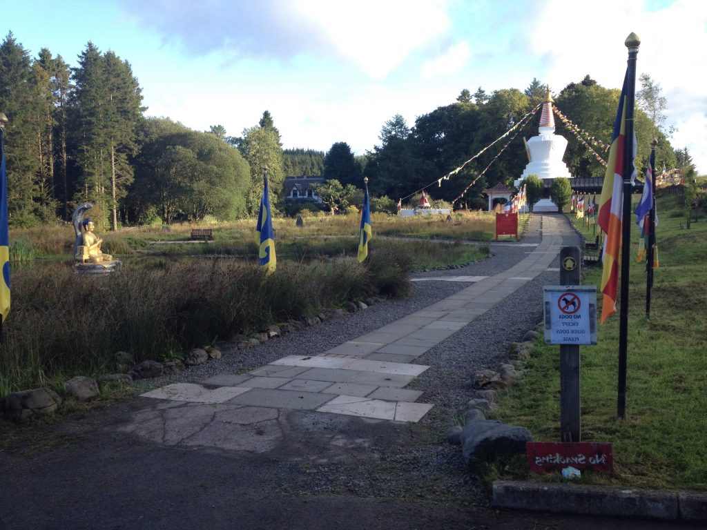 A stroll at the end of the day at Samye Ling, through the entrance gate, around the Nagarjuna lake with sounds of babbling brook in the distance, along the pathway lined with flags to the stupa. Turning the prayer wheels "Om Mani Peme Hung" then a glimpse of the stupa from the bridge over the water. Lovely sounds of water cascading down over the rocks from the pool around the Guru Rinpoche statue into the water below. Tranquillity. Gazing up the stupa lined driveway to the butter lamp house.